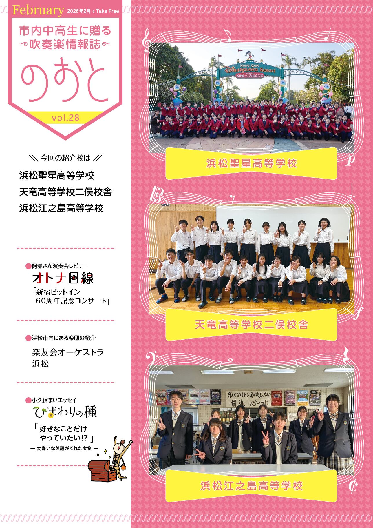 「のおと」は5・8・11・2月の年4回発行 [ 季刊 ] のフリーペーパーです。静岡県浜松市内の高校吹奏楽部(中・高吹奏楽部)を紹介する他、先輩であるプロ奏者のメッセージやエッセイ、演奏会レビュー、市内の楽団、演奏会情報などを掲載します。